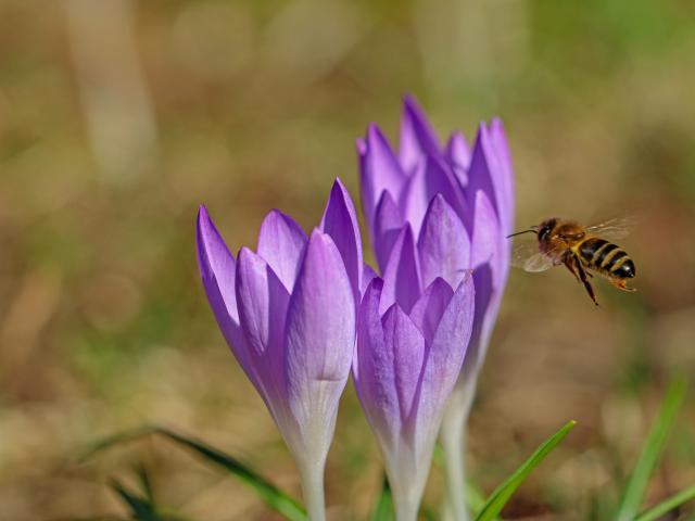 » Wallpaper Bee flies to lilac spring crocuses