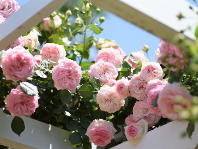 Wallpaper Pink park roses with buds on a flower bed