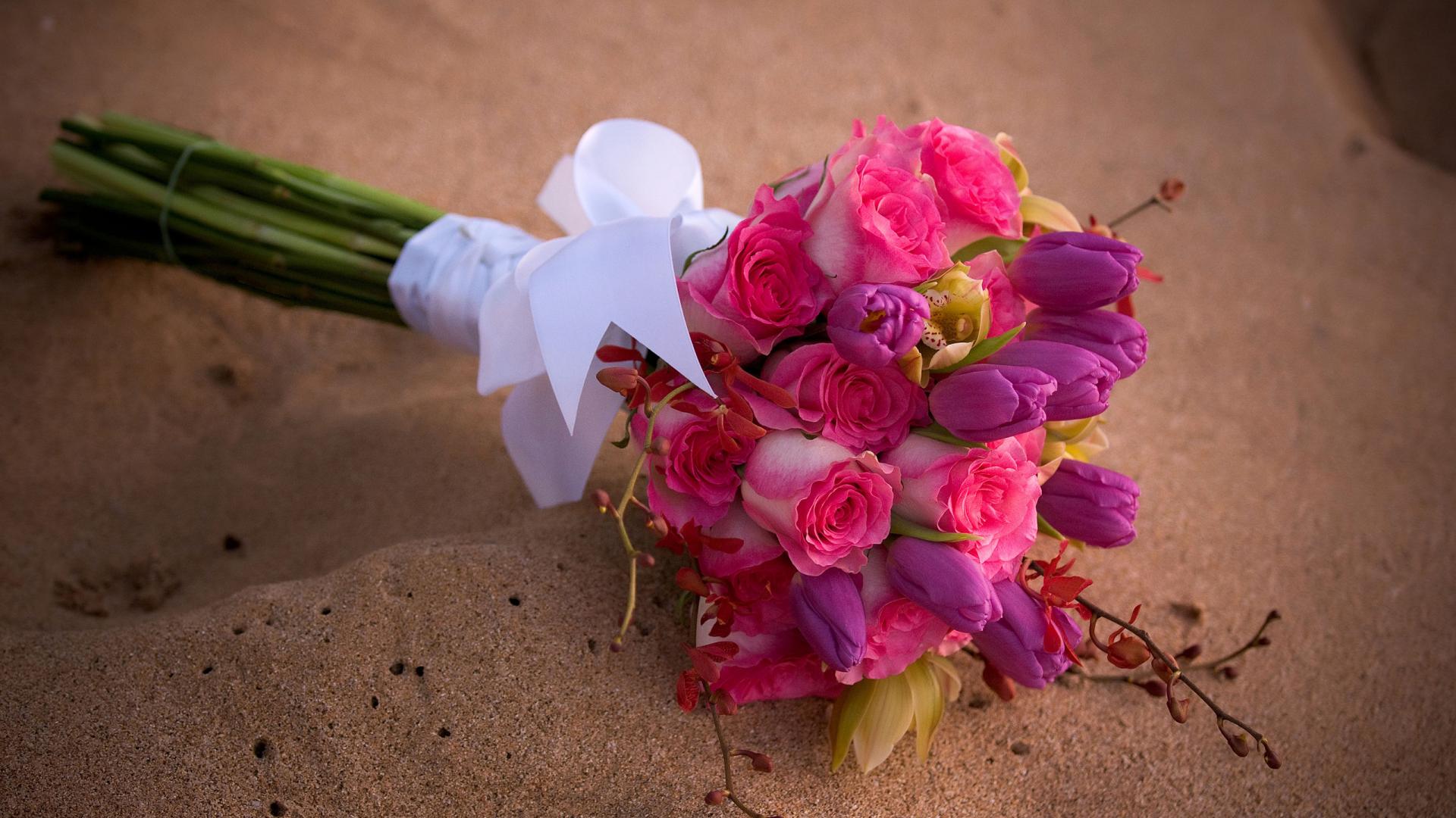 Wallpaper Beautiful bouquet of roses with tulips lies on the sand