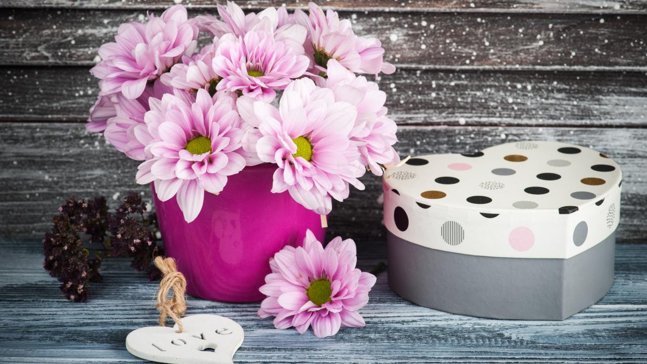 Wallpaper Bouquet of pink chrysanthemum flowers on a table with a box
