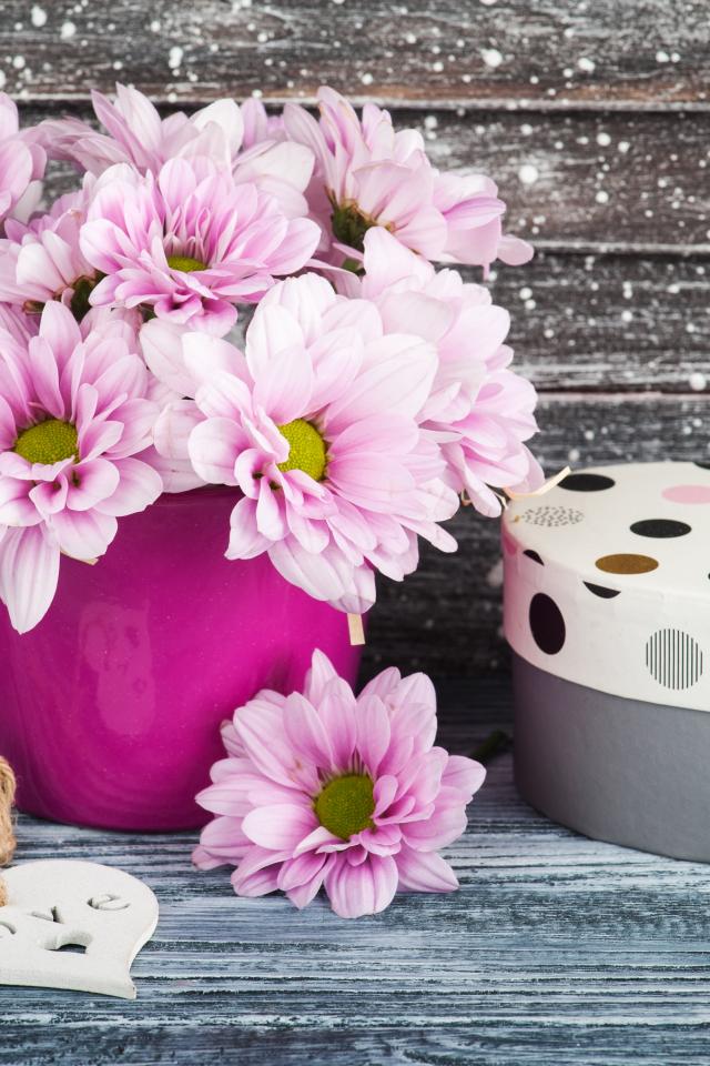 Wallpaper Bouquet of pink chrysanthemum flowers on a table with a box