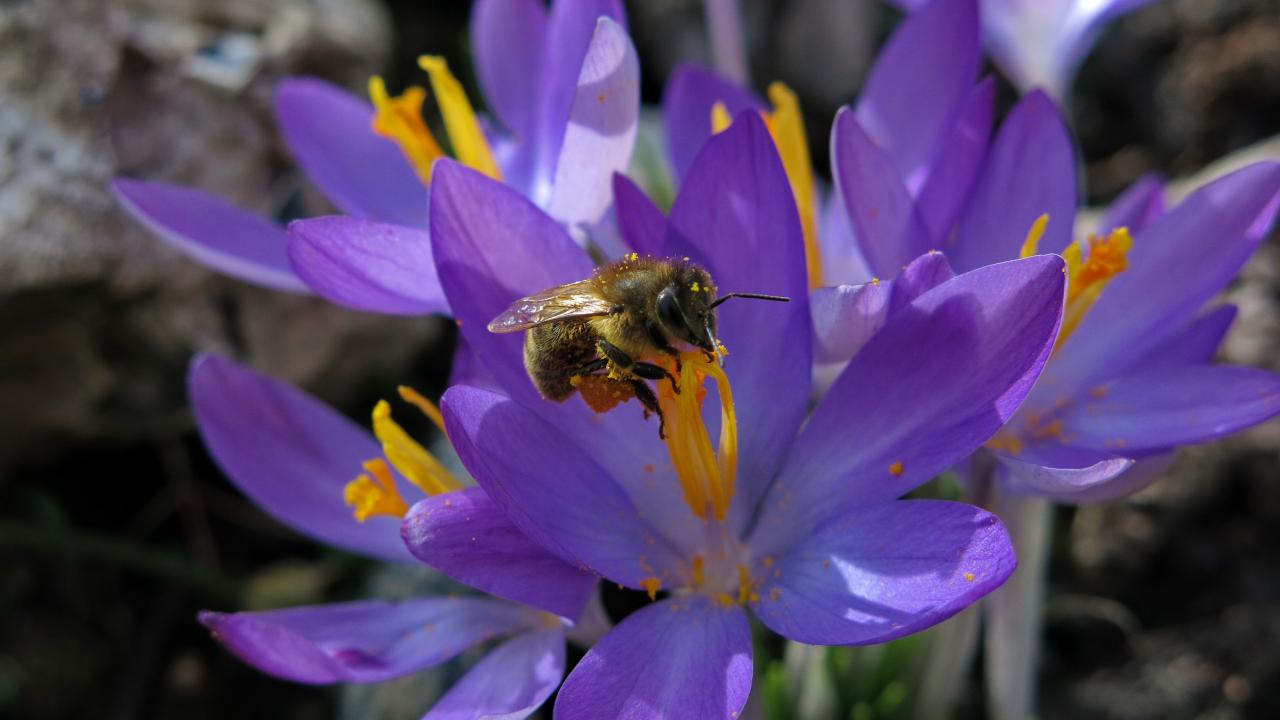 Wallpaper Beautiful little tender lilac crocuses with a bee