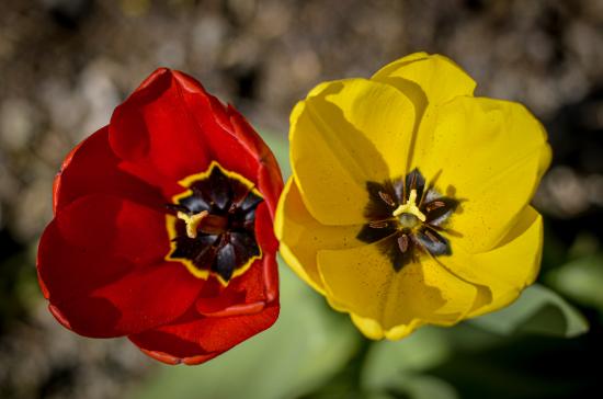 Wallpaper A bouquet of yellow and red-yellow tulips on a gray background