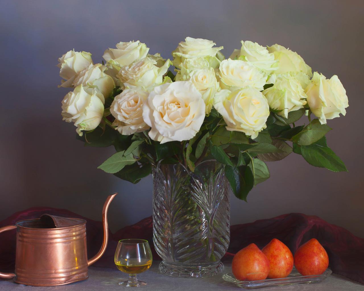 Wallpaper A large bouquet of white roses in a vase on a gray background