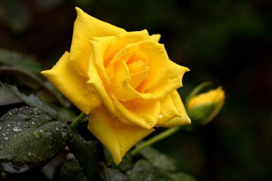 Wallpaper Beautiful yellow rose with a bud in drops of dew close-up