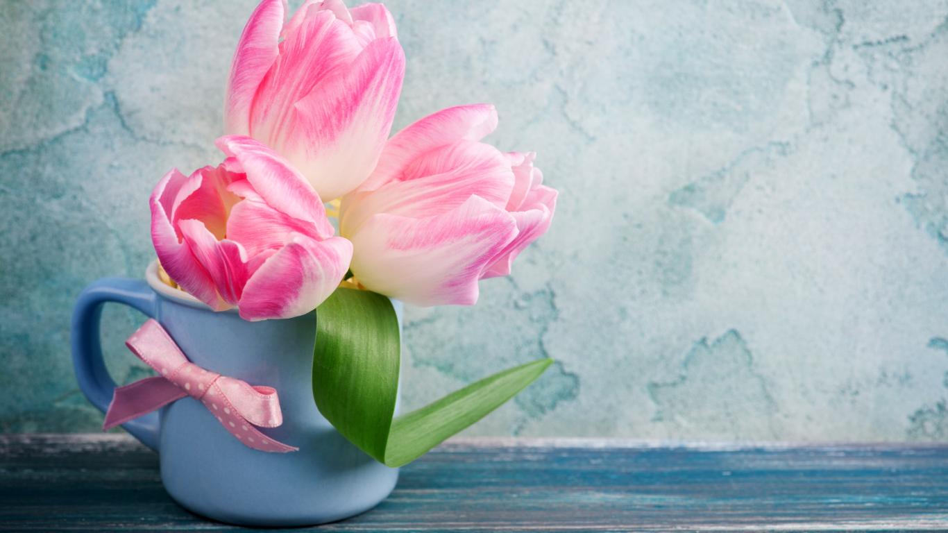 Wallpaper Three pink tulips in a cup on the table