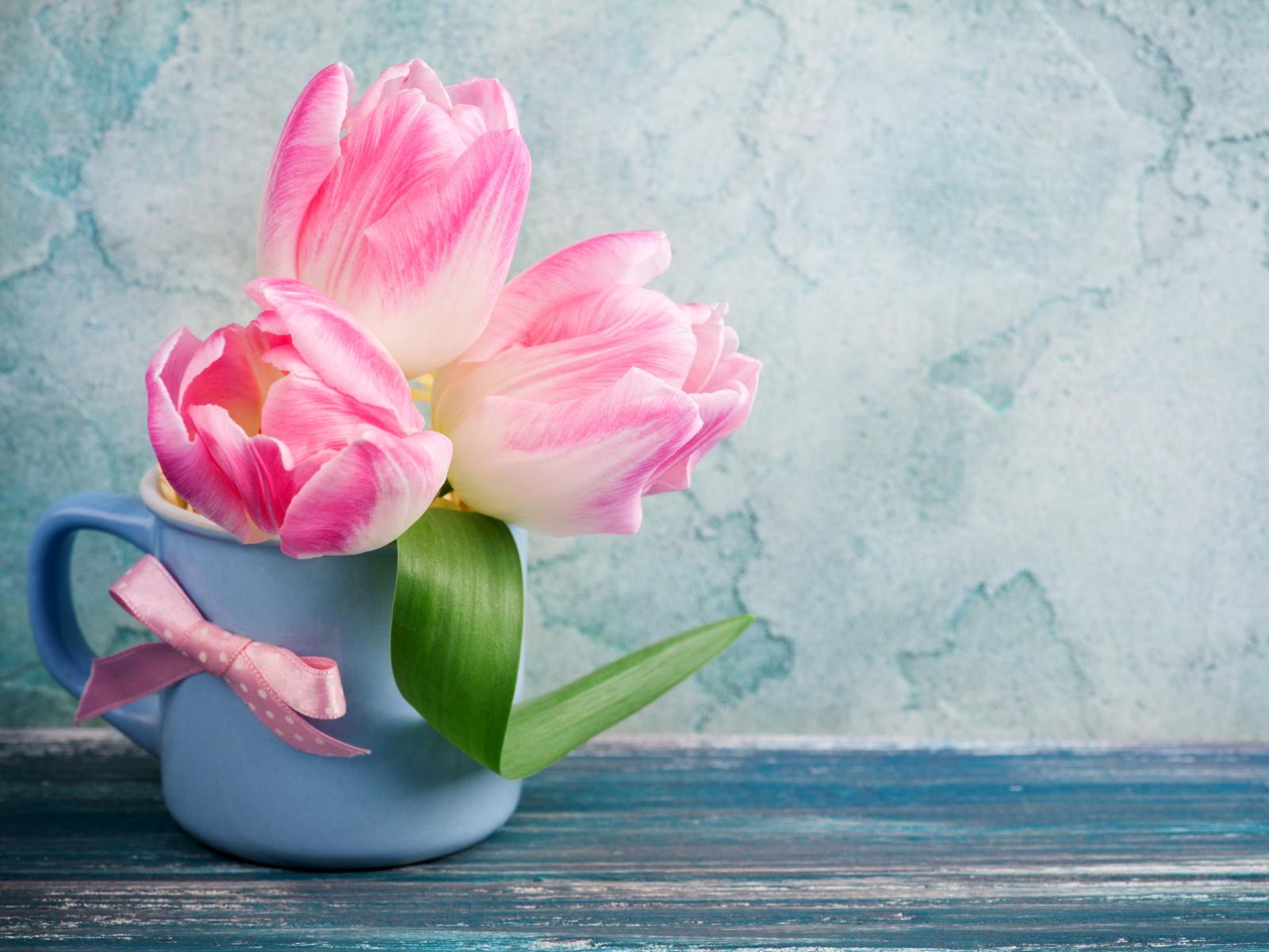 Wallpaper Three pink tulips in a cup on the table