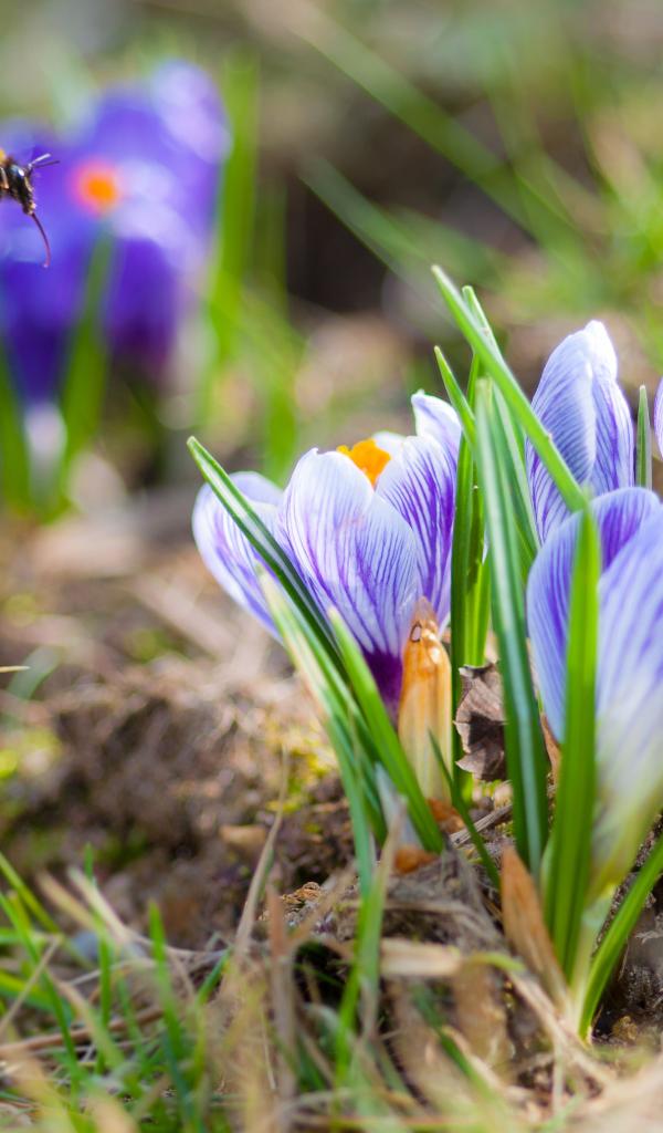 Wallpaper Beautiful little crocuses on a field with a bumblebee