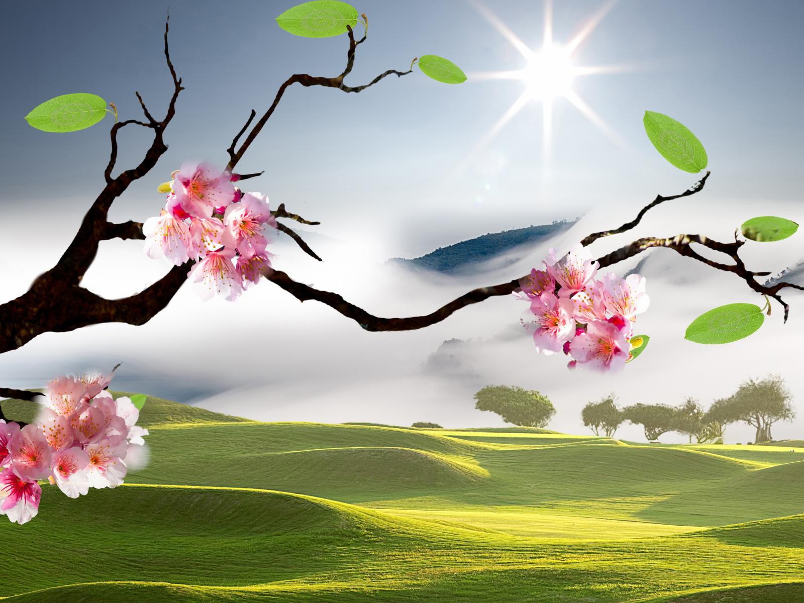 Wallpaper Pink sakura flowers on a branch in the rays of the bright sun