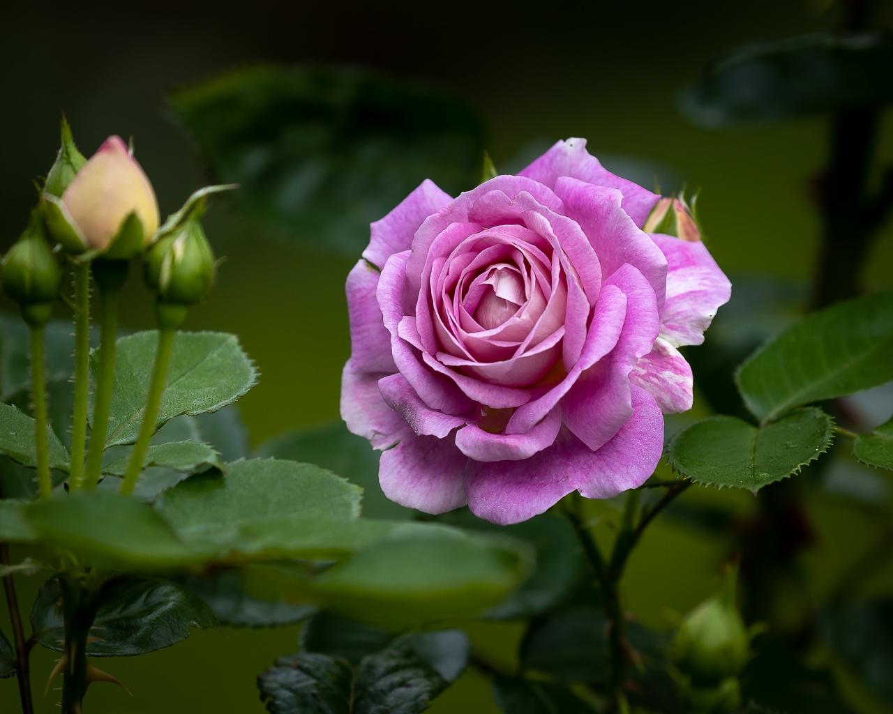 Wallpaper Pink rose with buds and green leaves in the flowerbed