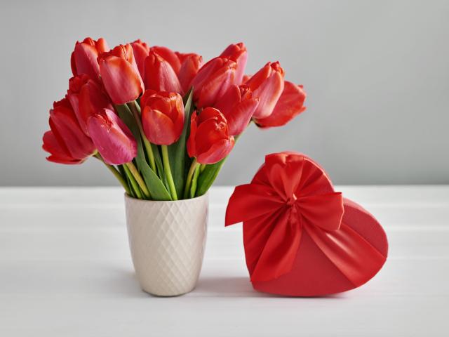 Wallpaper Bouquet of red tulips on a table with a heart-shaped box