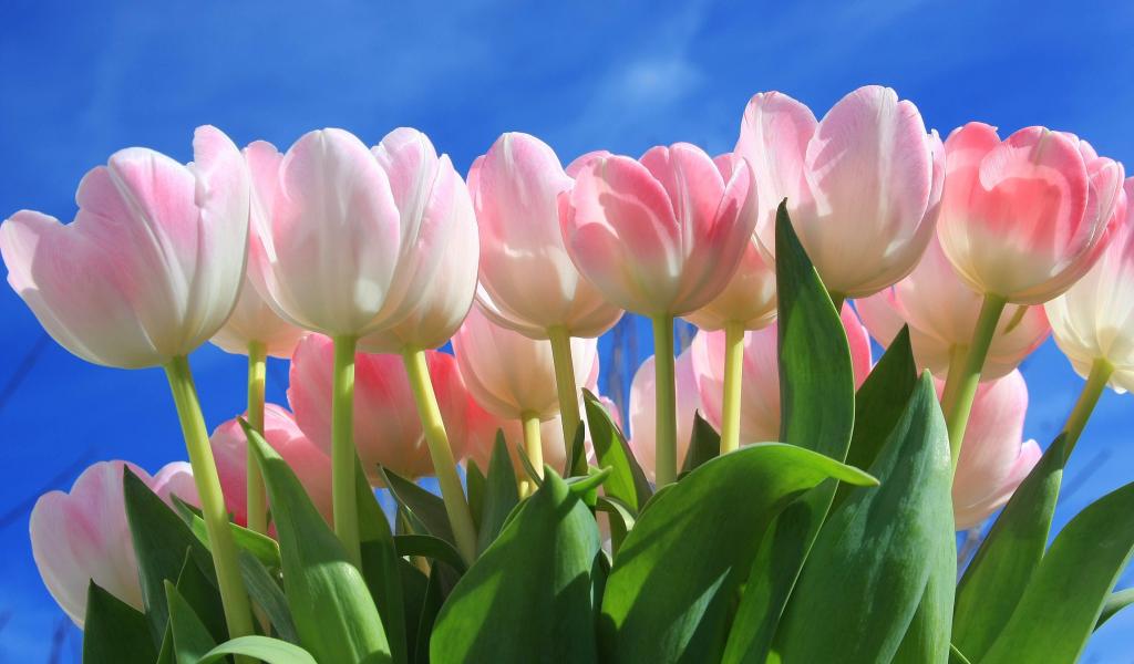 Wallpaper Bouquet of tender pink tulips on a background of blue sky
