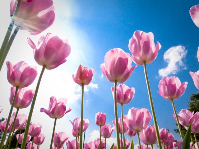 Wallpaper Pink flowers tulips on a background of blue sky