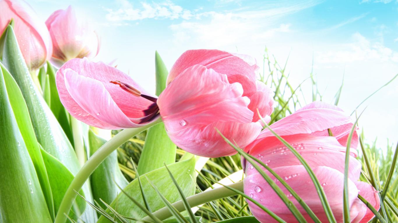 Wallpaper Pink tulip flowers in green grass against a blue sky