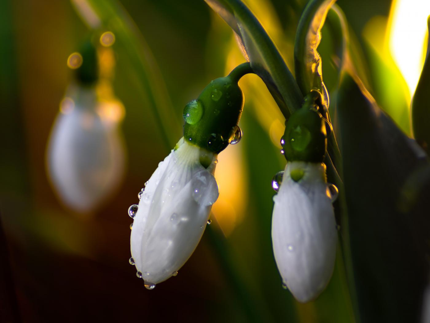 Wallpaper White snowdrops in dew drops close up