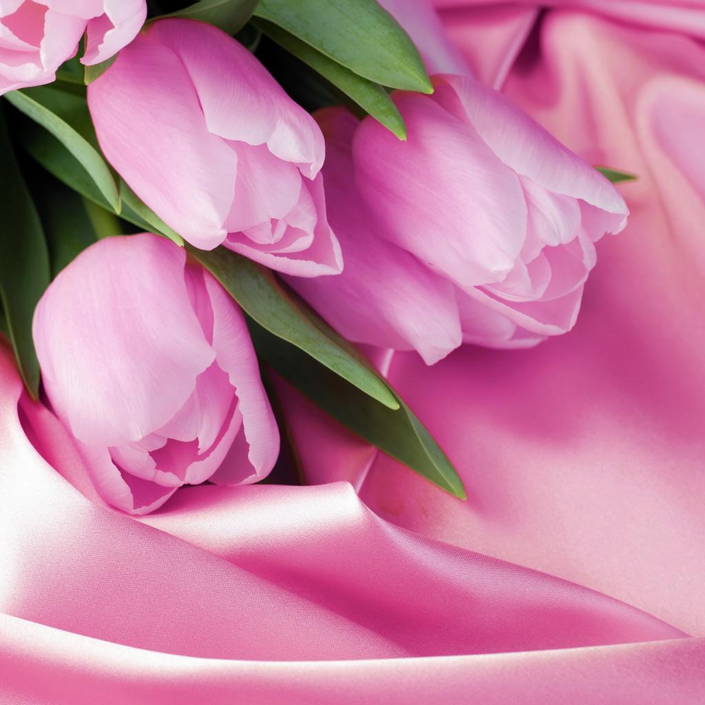 Wallpaper Bouquet of delicate tulips on a pink silk fabric