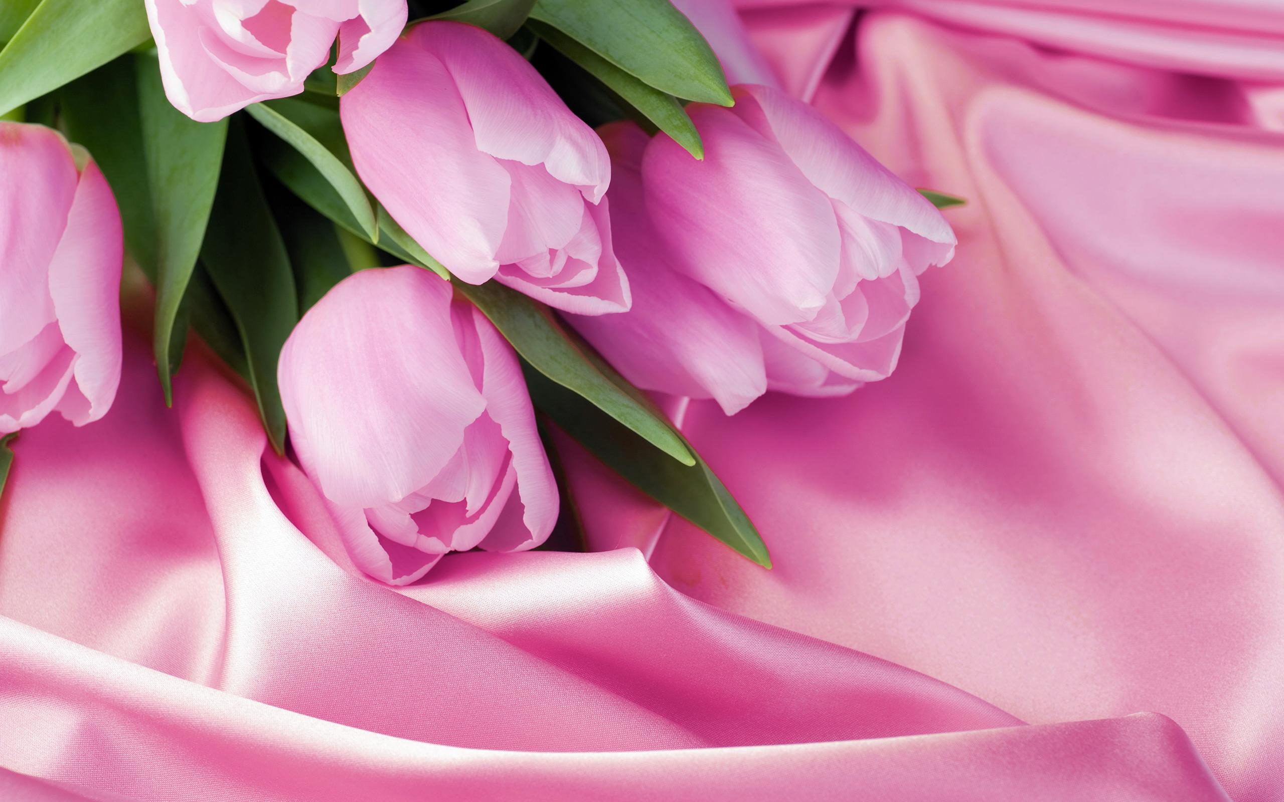 Wallpaper Bouquet of delicate tulips on a pink silk fabric
