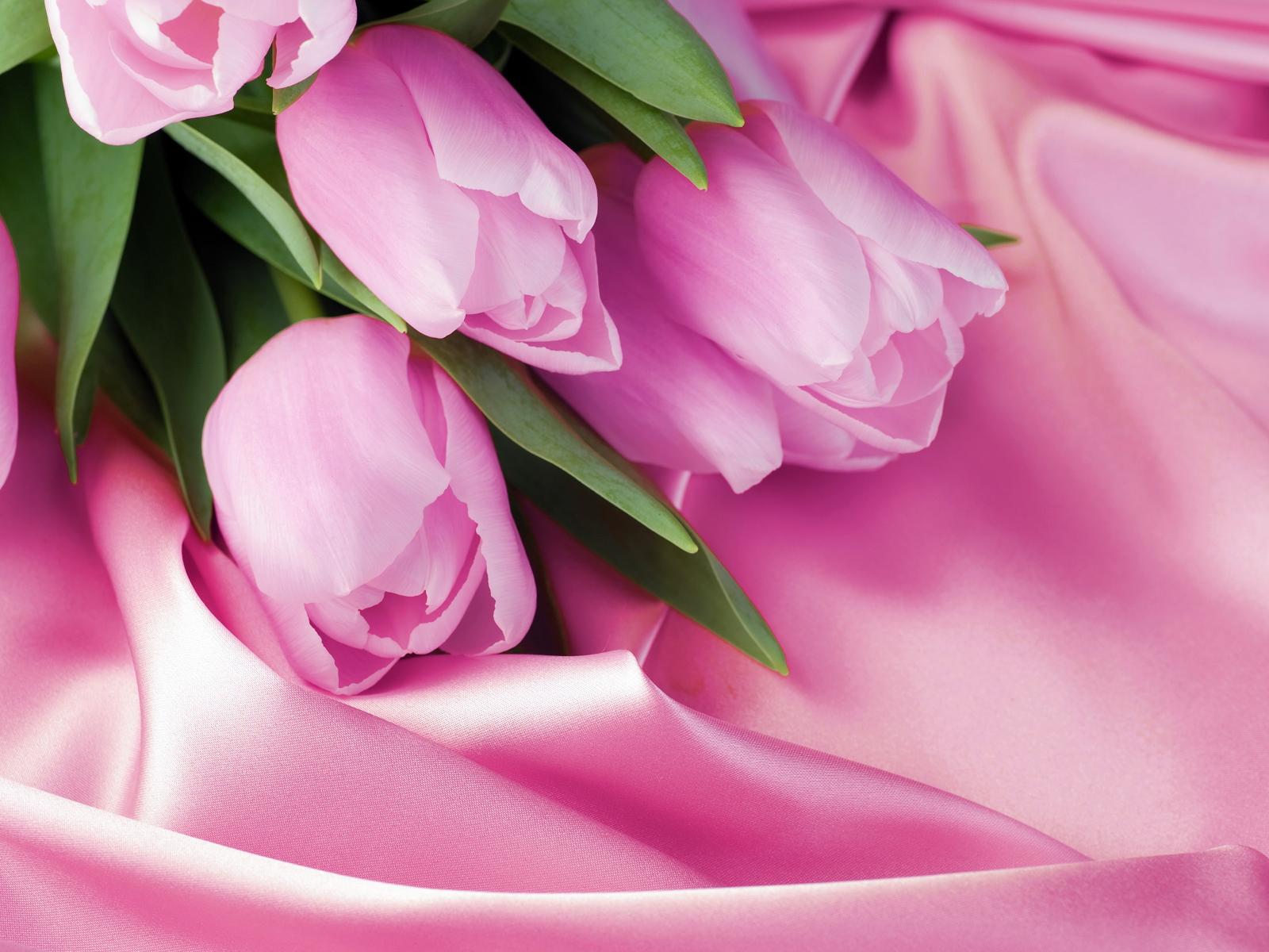 Wallpaper Bouquet of delicate tulips on a pink silk fabric