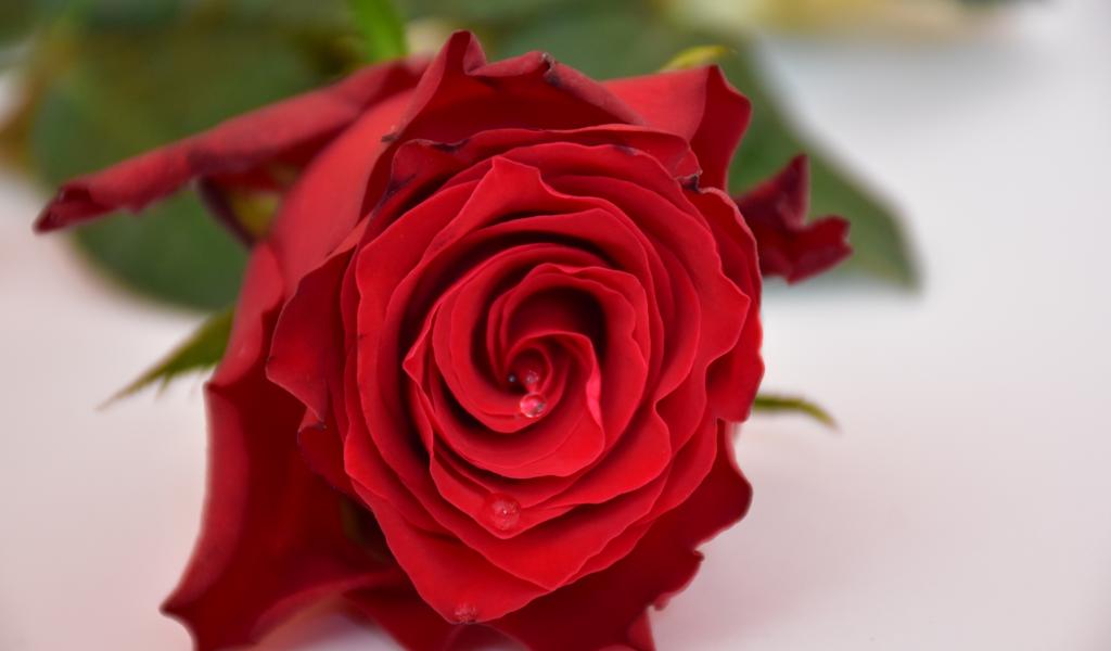 Wallpaper Scarlet rose in dew drops on a white table