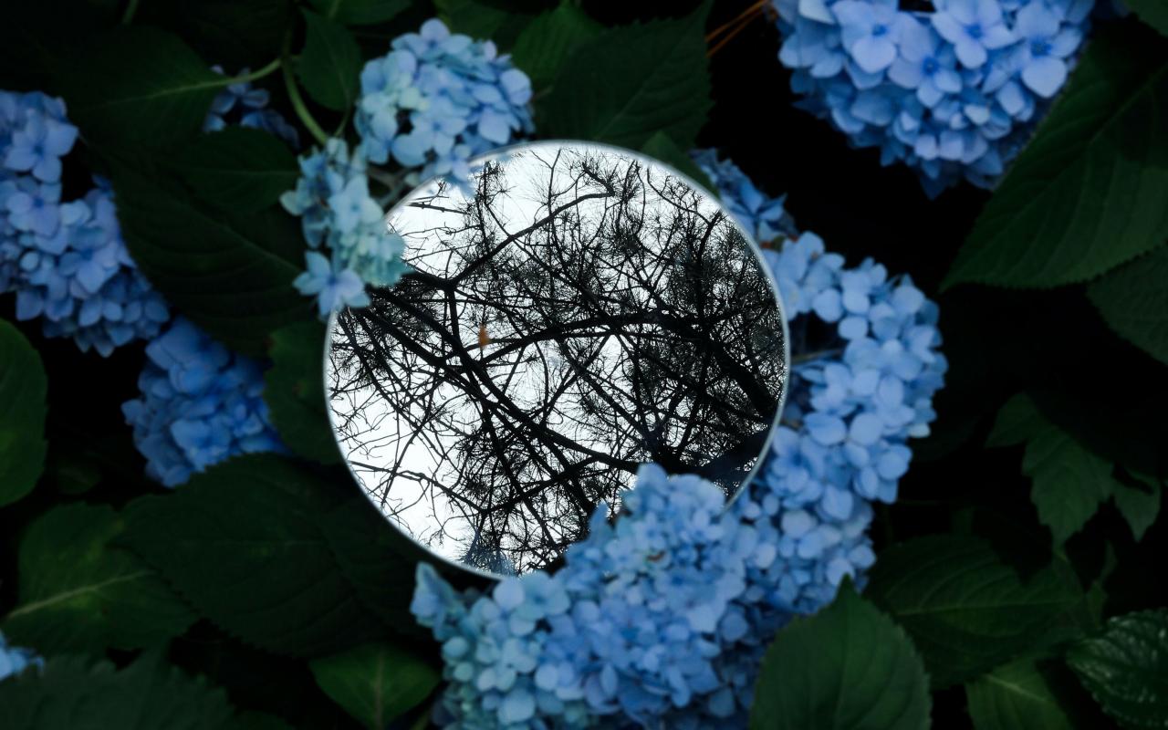 Wallpaper The mirror lies on the flowers of blue hydrangea