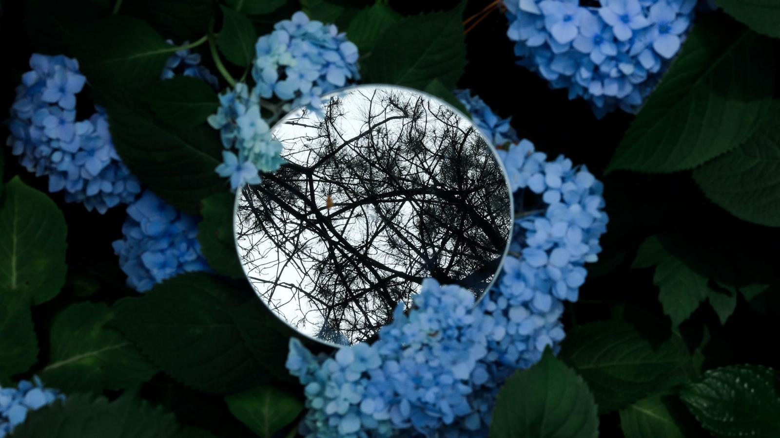 Wallpaper The mirror lies on the flowers of blue hydrangea