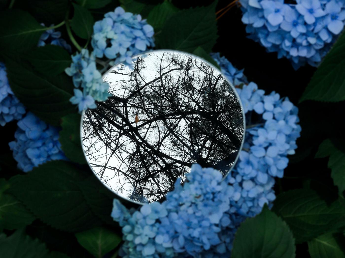 Wallpaper The mirror lies on the flowers of blue hydrangea
