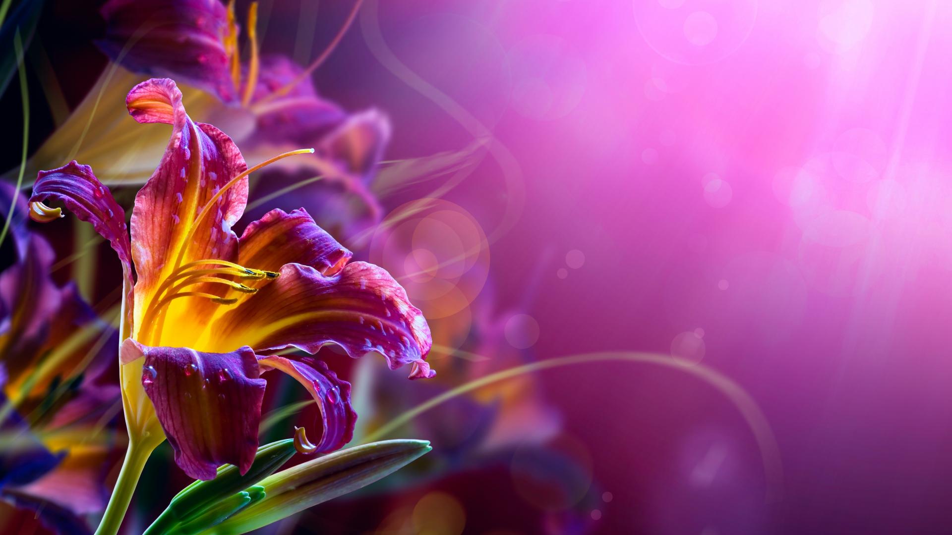 Wallpaper Bouquet of tender pink lilies in a glass vase on a white background