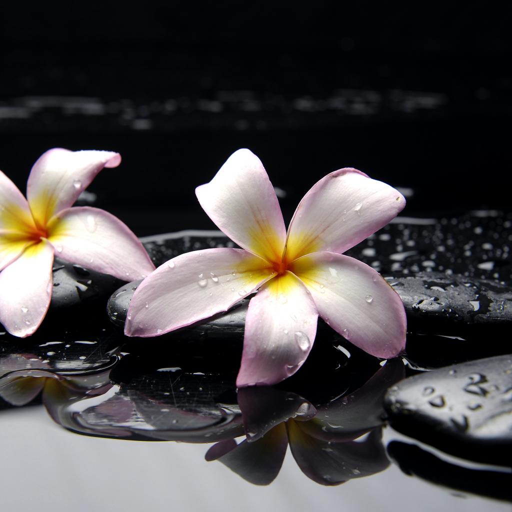 Wallpaper Two pink plumeria flowers on wet black stones
