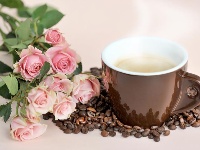 Wallpaper Bouquet of pink roses with a cup of coffee and grains.