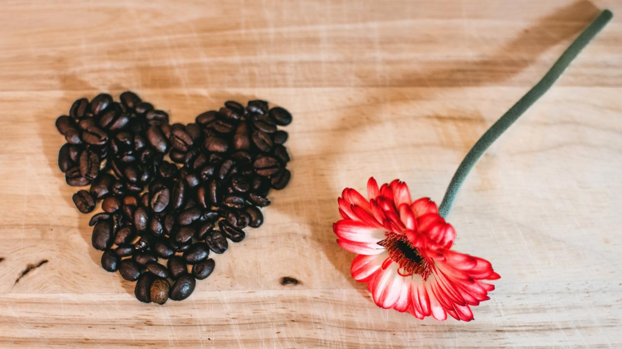 Wallpaper Red gerbera and heart made from coffee beans on the table