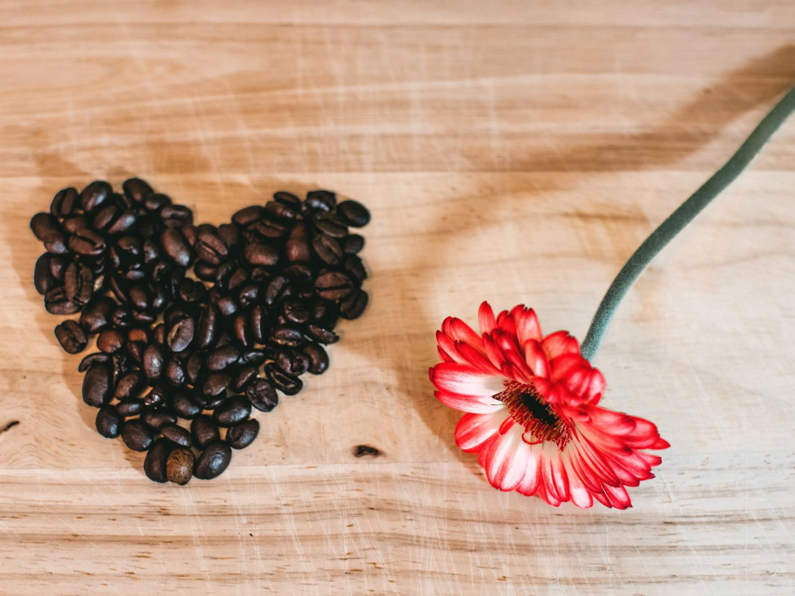 Wallpaper Red gerbera and heart made from coffee beans on the table