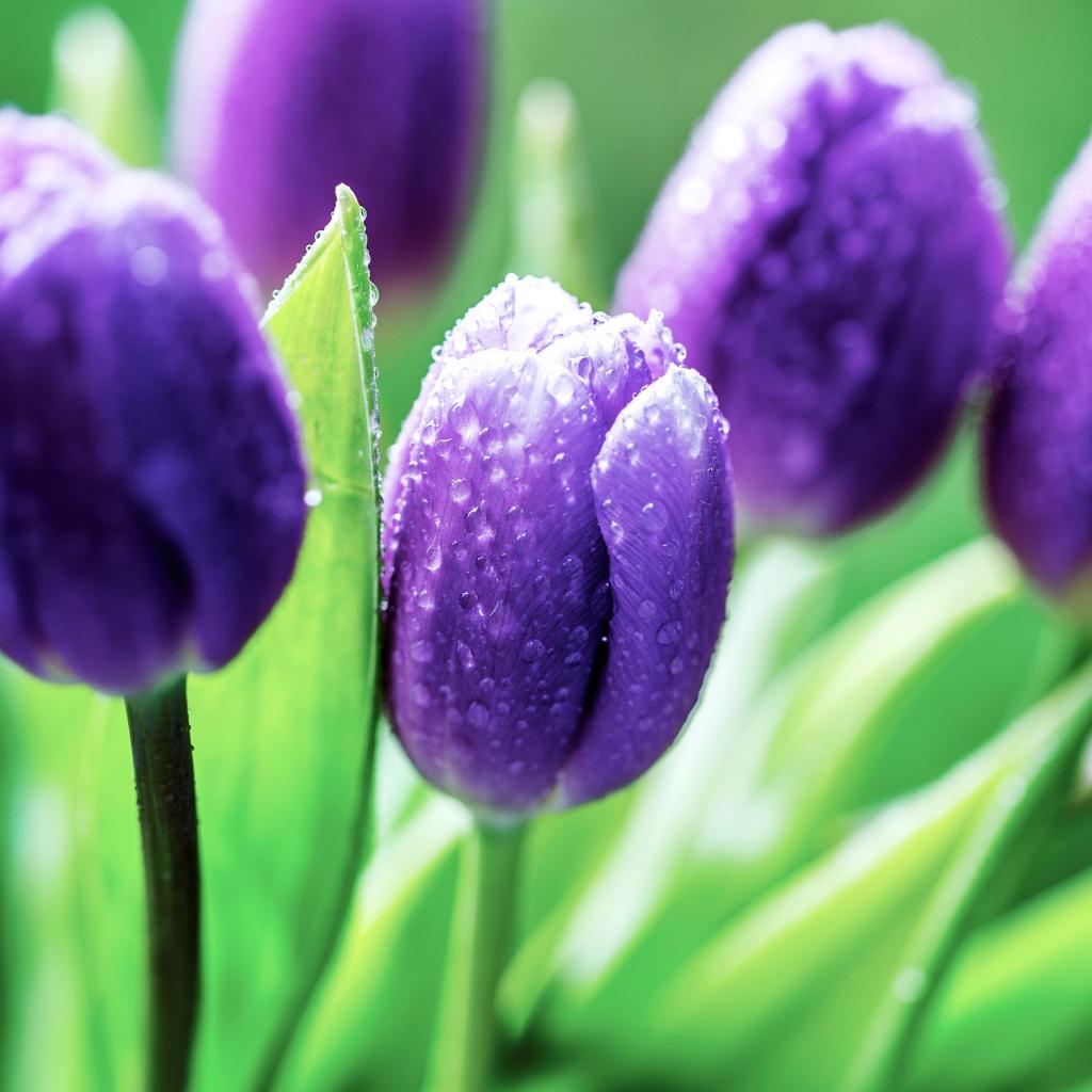 Wallpaper Purple tulips in the drops of a rose in the morning