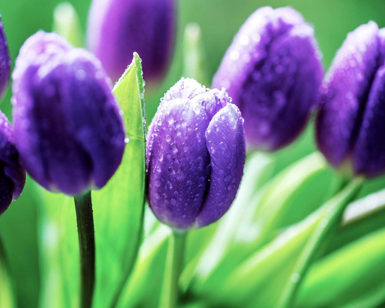 Wallpaper Purple tulips in the drops of a rose in the morning