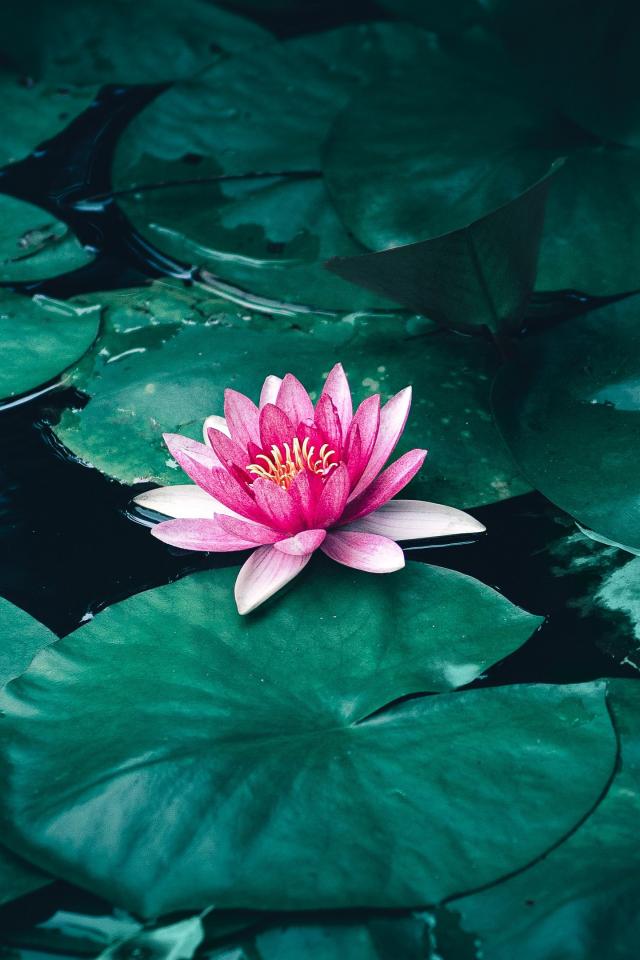 Wallpaper Pink water lily with green leaves in a pond