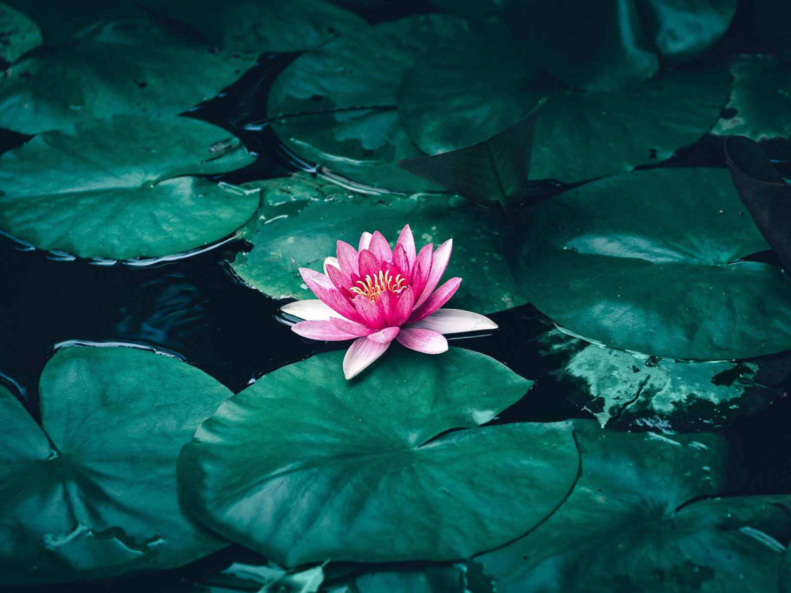 Wallpaper Pink water lily with green leaves in a pond