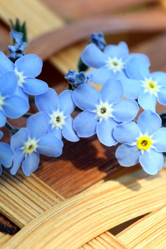 Wallpaper Little blue forget-me-not flowers lie on a wicker basket