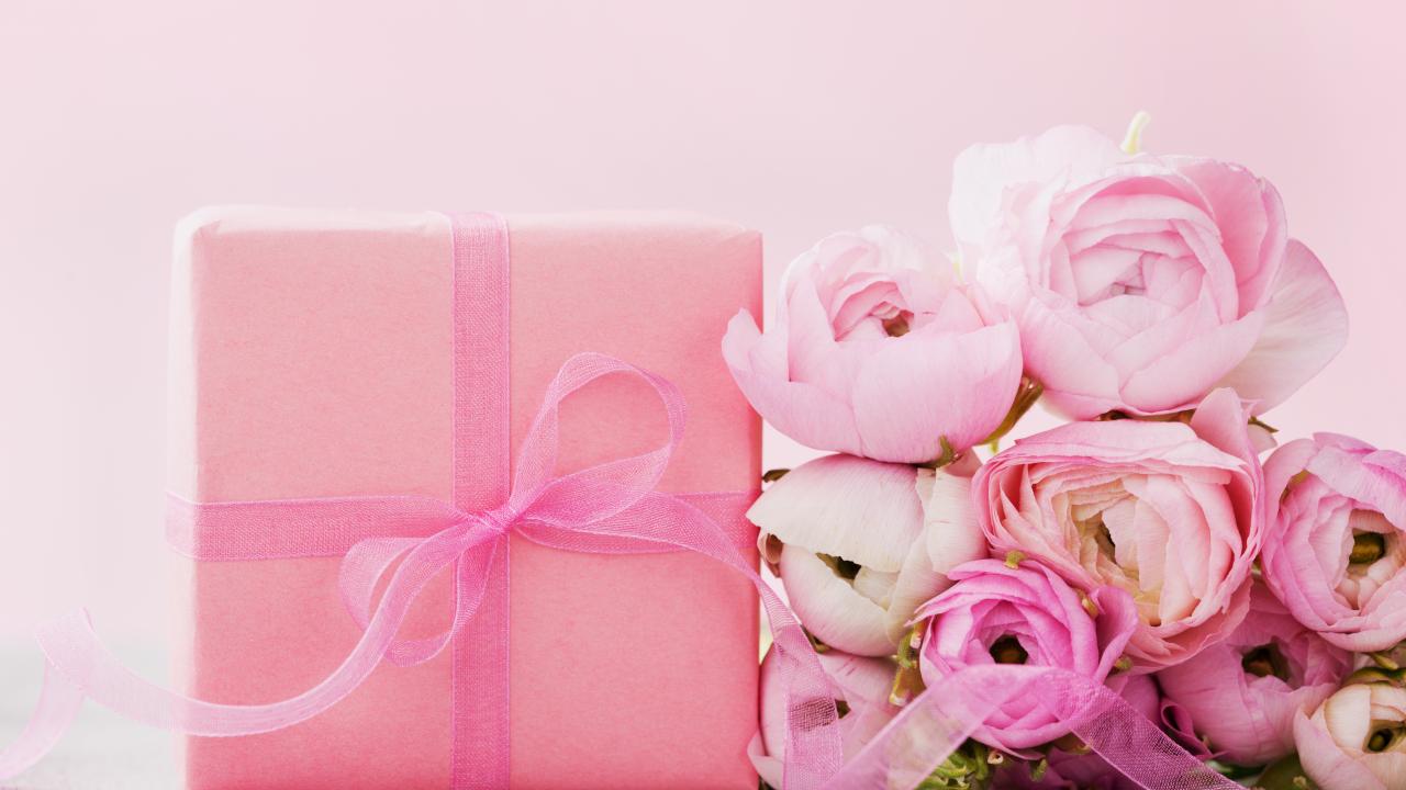 Wallpaper Pink buttercups with a gift on a pink background