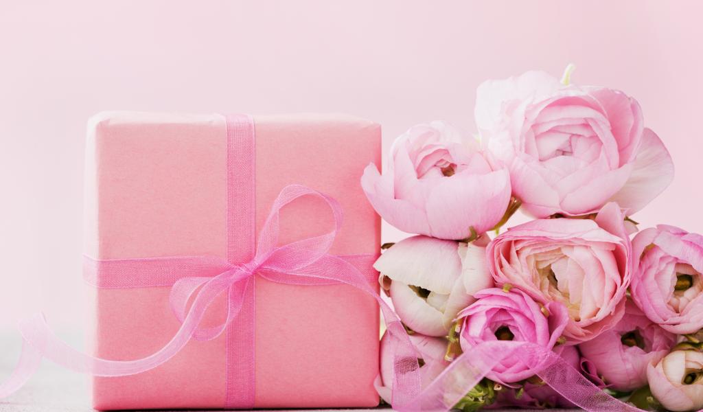 Wallpaper Pink buttercups with a gift on a pink background