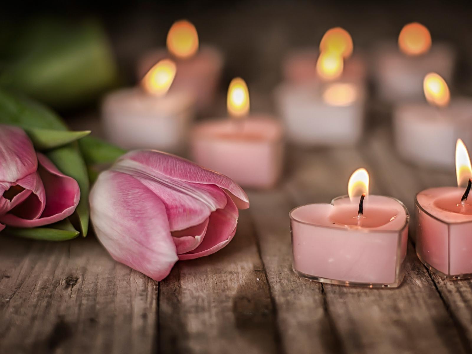 Wallpaper Lighted walls on a table with pink tulips