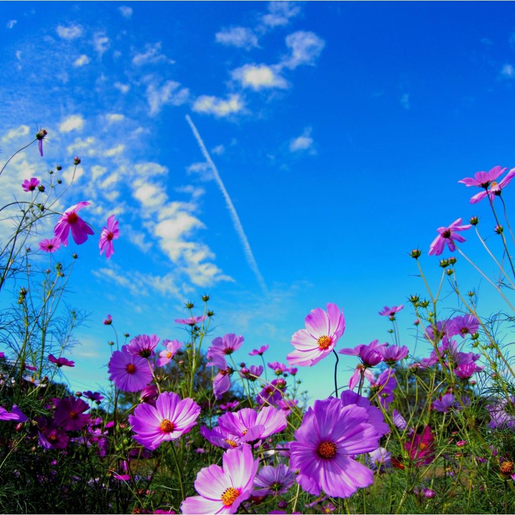 Wallpaper Bright pink cosmea flowers against a blue sky