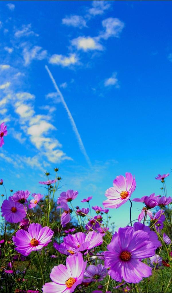 Wallpaper Bright pink cosmea flowers against a blue sky