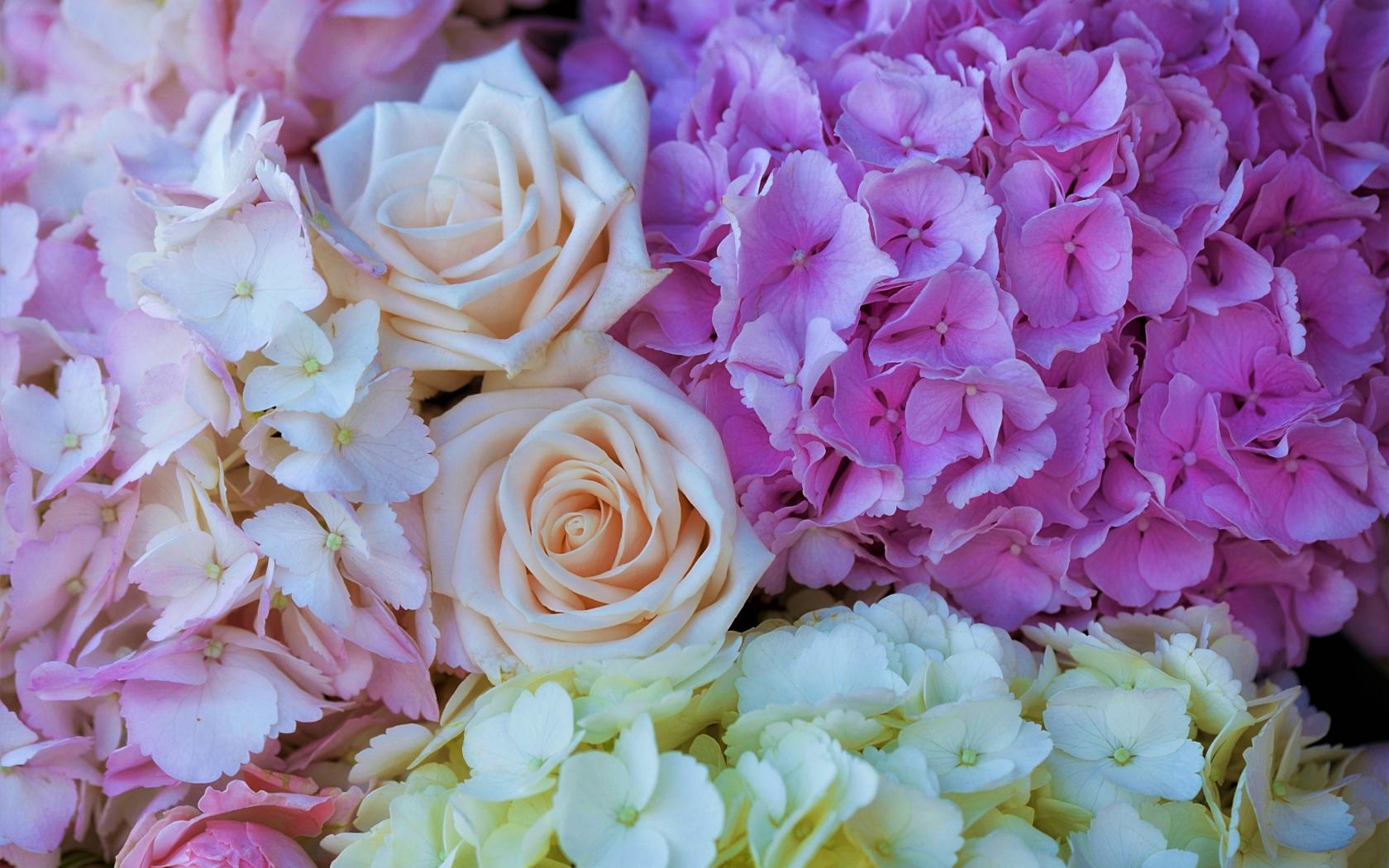 Wallpaper Bouquet of hydrangea and rose flowers close-up