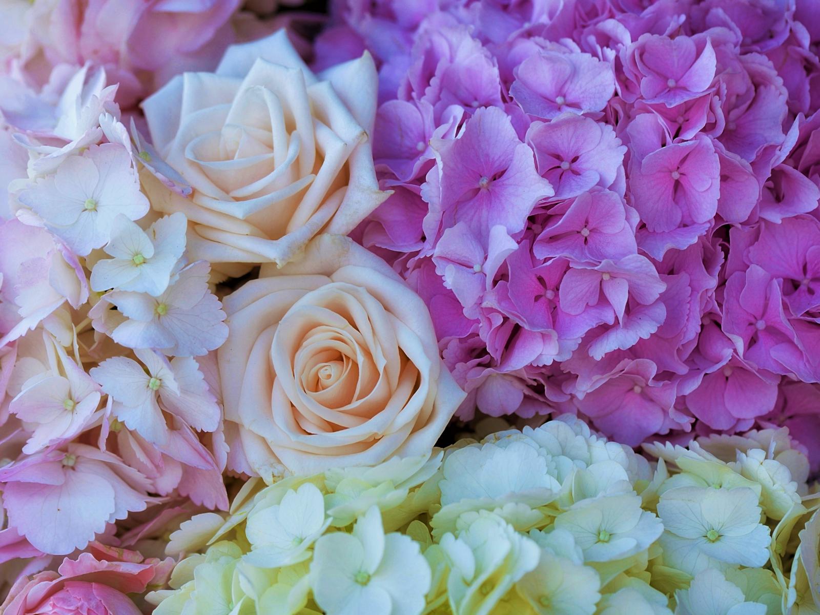 Wallpaper Bouquet of hydrangea and rose flowers close-up