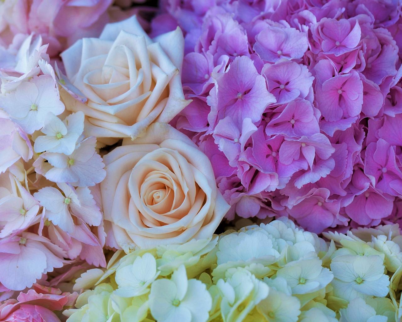 Wallpaper Bouquet of hydrangea and rose flowers close-up