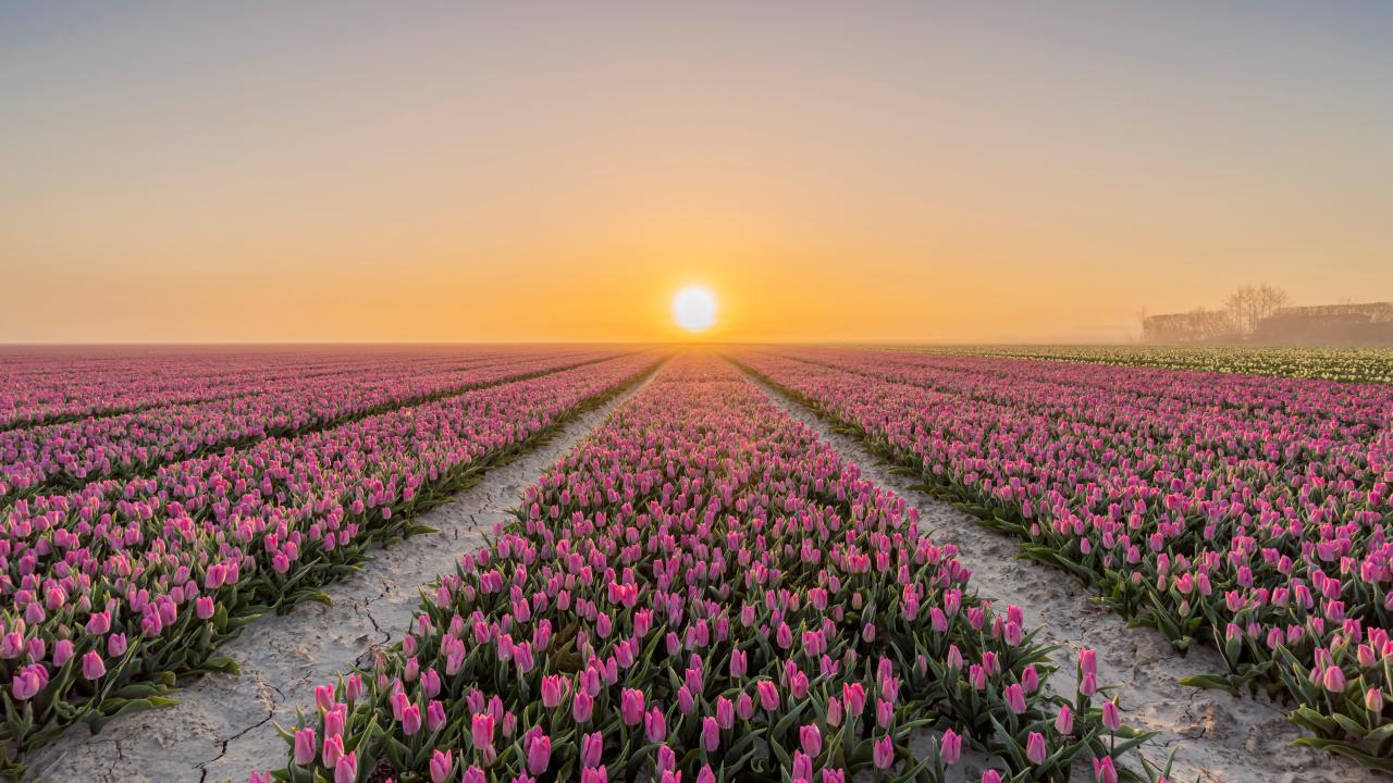 Wallpaper Fields with pink tulips on a sunset background