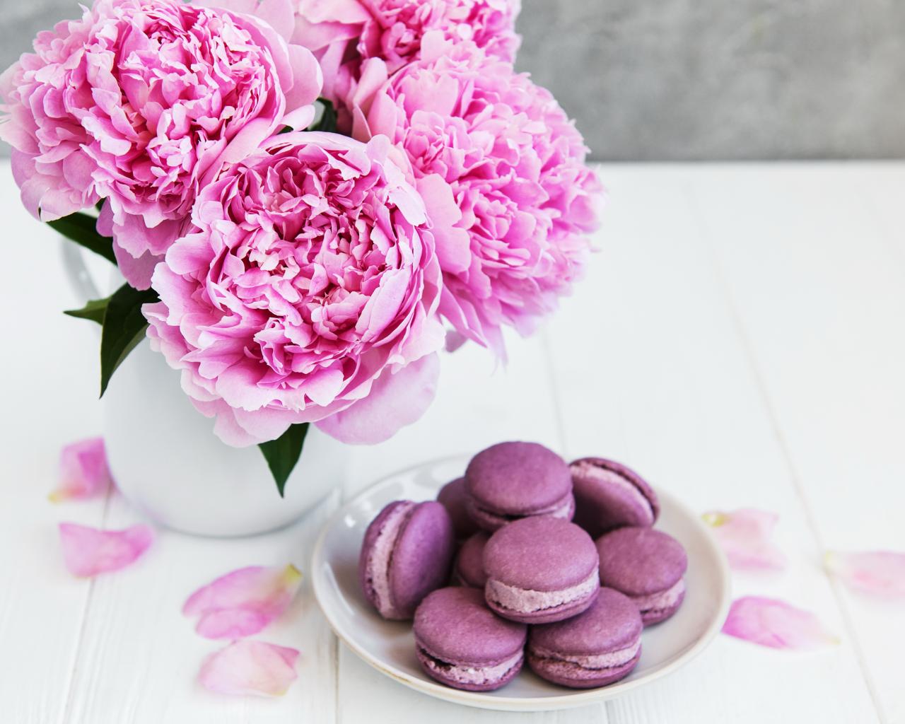 Wallpaper Bouquet of pink peonies on a white table with pasta dessert