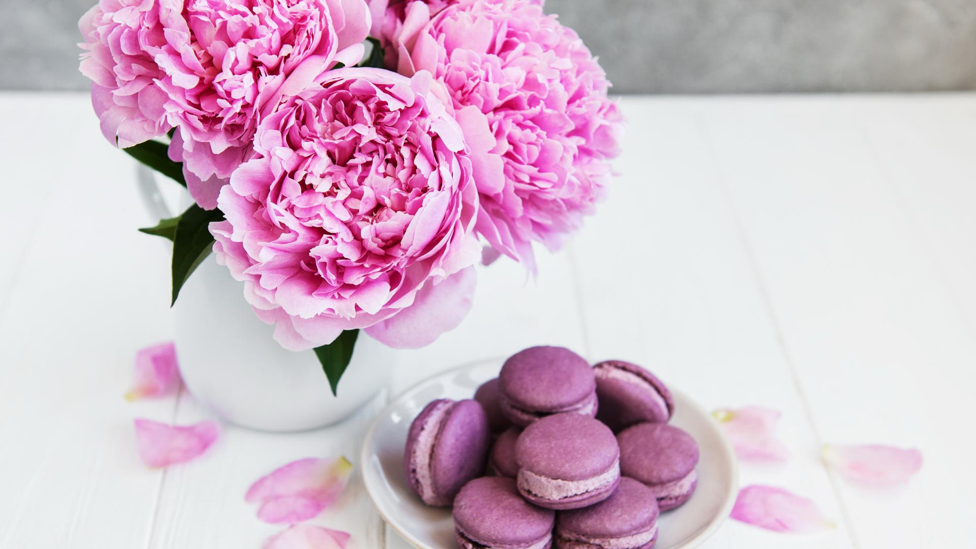 Wallpaper Bouquet of pink peonies on a white table with pasta dessert