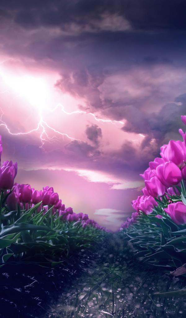 Wallpaper Stormy sky with lightning over a field with tulips