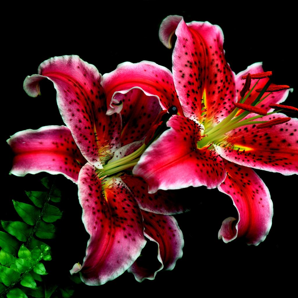 Wallpaper Pink flowers of tiger lily close-up on black background