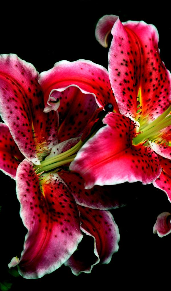 Wallpaper Pink flowers of tiger lily close-up on black background